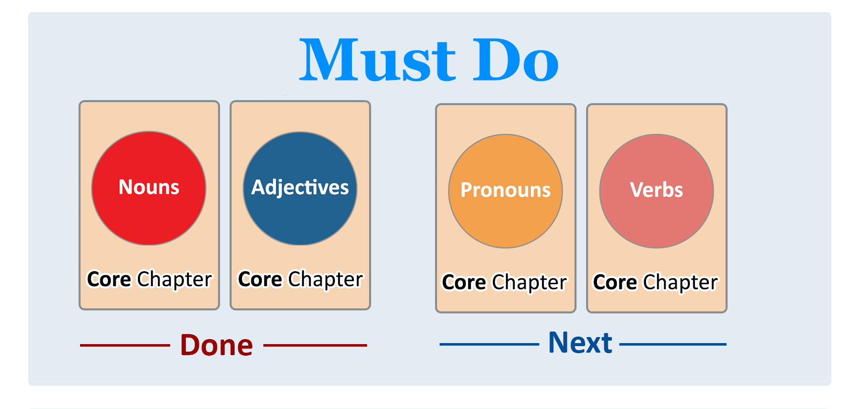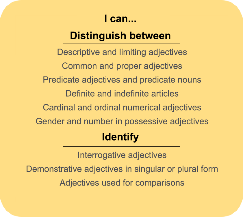 Check your progress one more time as you review this illustration! You have learned the basics of the second building block: Adjectives!
