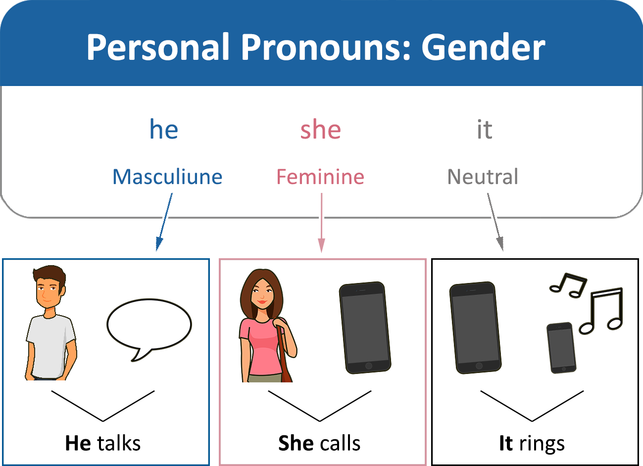 There are three pronouns showing gender: masculine-he, feminine-she, and neutral-it.