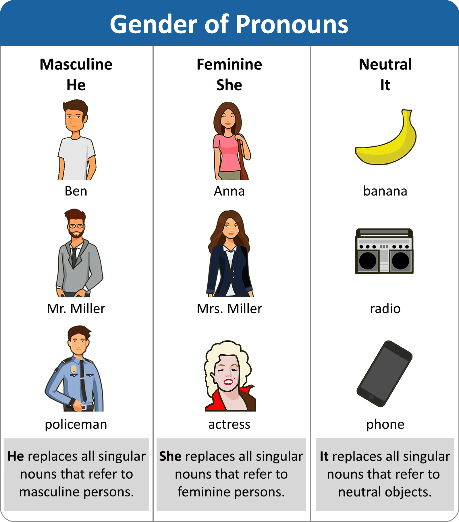 Consider this chart illustrating how nouns for people and things can each be replaced with a matching pronoun: