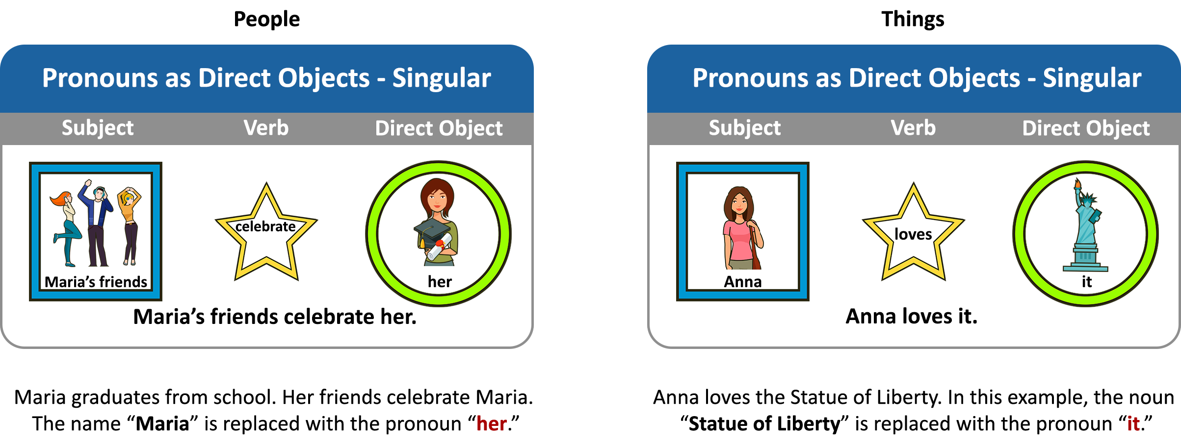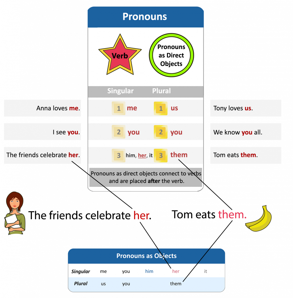For example, when you see a sentence like, “Maria’s friends celebrate her,” this chart will help you locate “her” in the chart and identify “her” as a direct object pronoun.